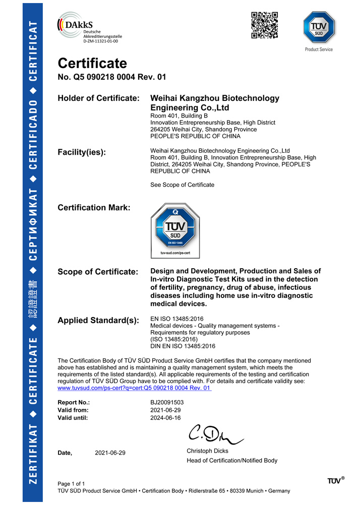 ? ? ?威海康州生物工程有限公司成立于2013年,公司坐落于風(fēng)景秀麗的海濱小城——威海市??抵萆锸羌邪l(fā)、生產(chǎn)和銷售于一體的生物科技公司,與威海哈爾濱工業(yè)大學(xué)合作研發(fā)團(tuán)隊(duì),擁有先進(jìn)的科研基地及生產(chǎn)基地。主要從事快速診斷檢測(cè)產(chǎn)品的研發(fā)、生產(chǎn)、銷售。產(chǎn)品涵蓋:生育檢測(cè)、藥物濫用檢測(cè)、農(nóng)藥殘留檢測(cè)以及其他臨床診斷檢測(cè)等。公司自主研發(fā)生產(chǎn)得早早孕試紙,排卵檢測(cè)試紙,毒品檢測(cè)及疾病檢測(cè)等醫(yī)用產(chǎn)品,經(jīng)過歐盟認(rèn)證,產(chǎn)品質(zhì)量穩(wěn)定,值得信賴。